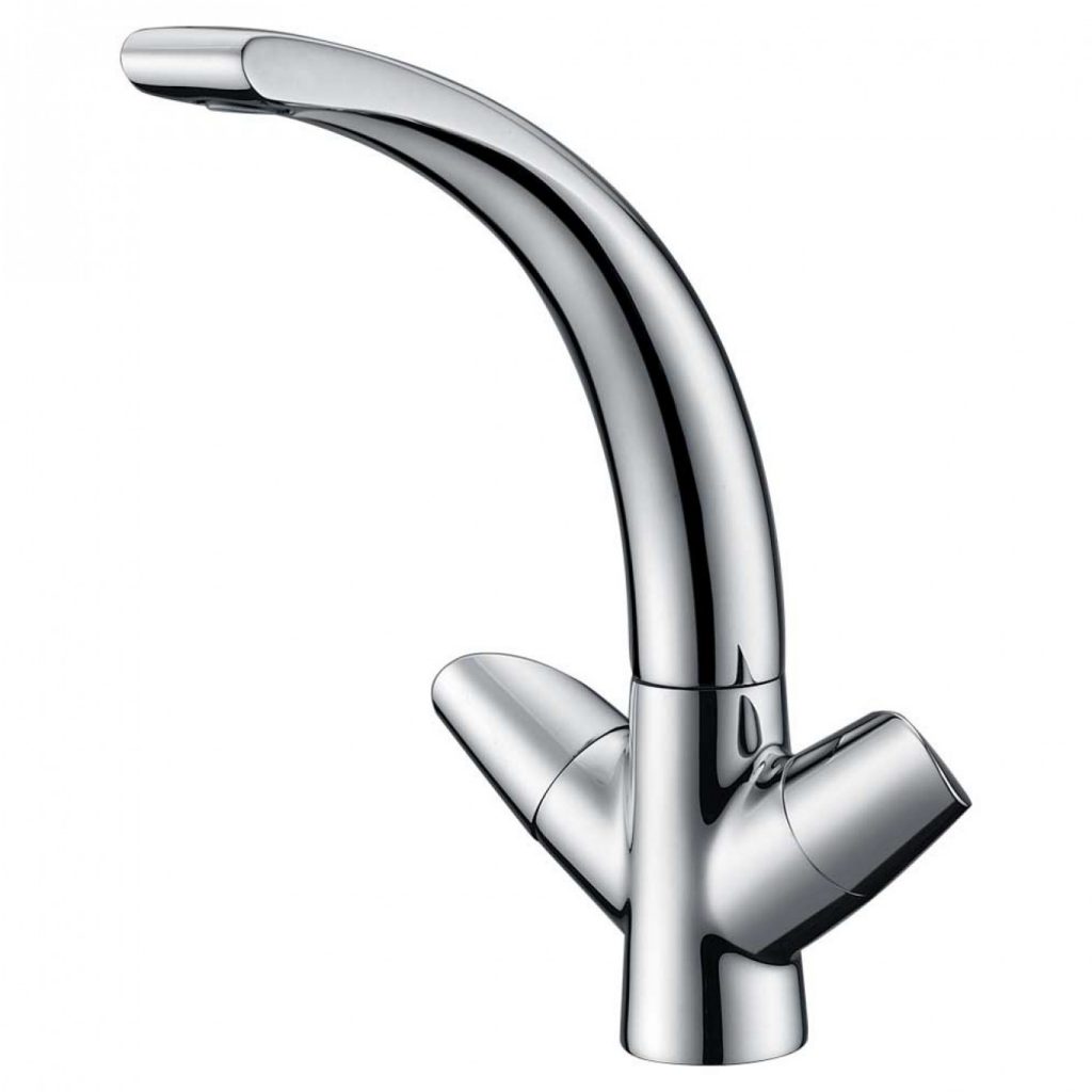 - С двумя вентилями – достаточно распространенная модель. Конструкция включает два краника с изливом посредине. С помощью вентилей регулируется интенсивность потока воды. Стоимость этого сантехнического устройства невысокая. Но с каждым годом большинство покупателей все реже покупают эту модель. Он отличается непродолжительным сроком эксплуатации, прокладки изнашиваются, комплектующие очень быстро выходят из строя. Однако есть небольшое преимущество – при поломке одного из вентилей достаточно использовать только кран-буксу, не прибегая к замене всего смесителя.