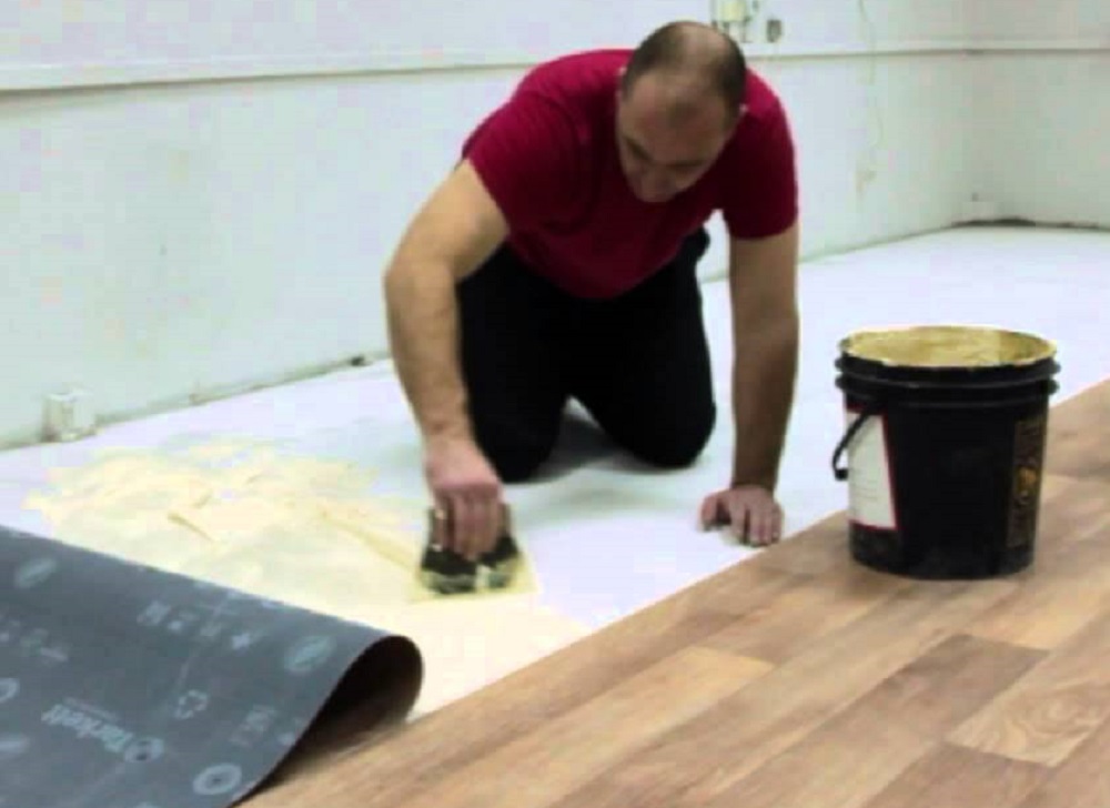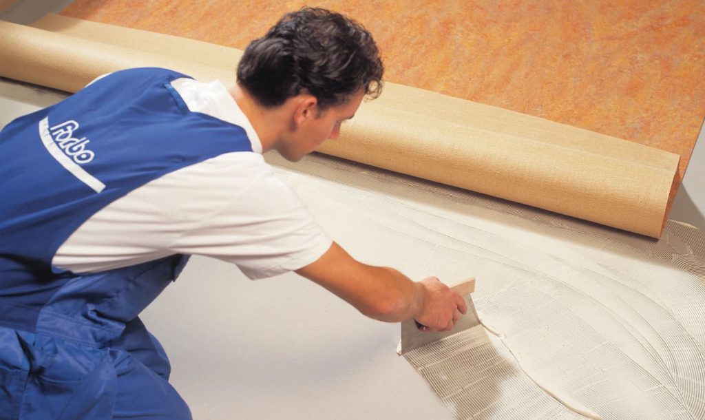 Рулон линолеума скучивайте лицевой стороной внутрь. Далее, как на пол, так и на линолеум равномерно наносится мастика. В среднем ее толщина может составлять до 0,5 мм. Как только линолеум будет приклеен, необходимо тщательно разгладить поверхность с помощью валика.