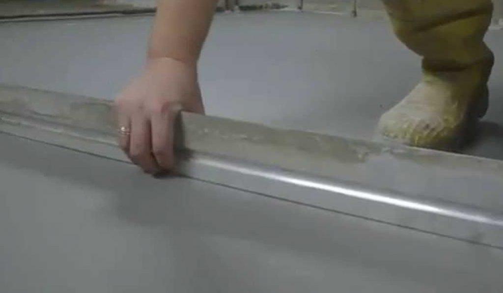 - Затем приготовленный раствор нужно вылить между маячками. Сделайте это осторожно, иначе можете повредить установленный ранее маяк. Вся пространство должно быть заполнено раствором, который выравнивается правилом по маякам.