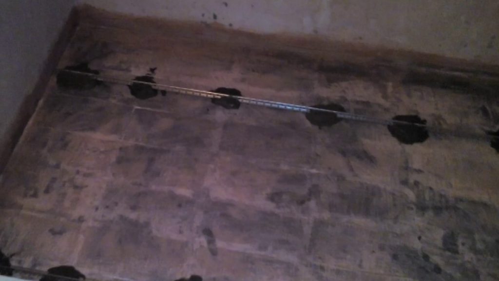 - Как только уровень будет обозначен, стоит установить рейку или маяки. При этом по плоскости от стены к стене натягивается веревка (можно в форме зигзага). Веревка крепится к отметке обозначенного уровня пола. Как следствие, Вы можете ставить в отдельности каждый из маяков. Сами маяки лучше устанавливать на цементный раствор. До тех пор, пока он не высохнет, Вы можете поправлять окончательное положение маяка.