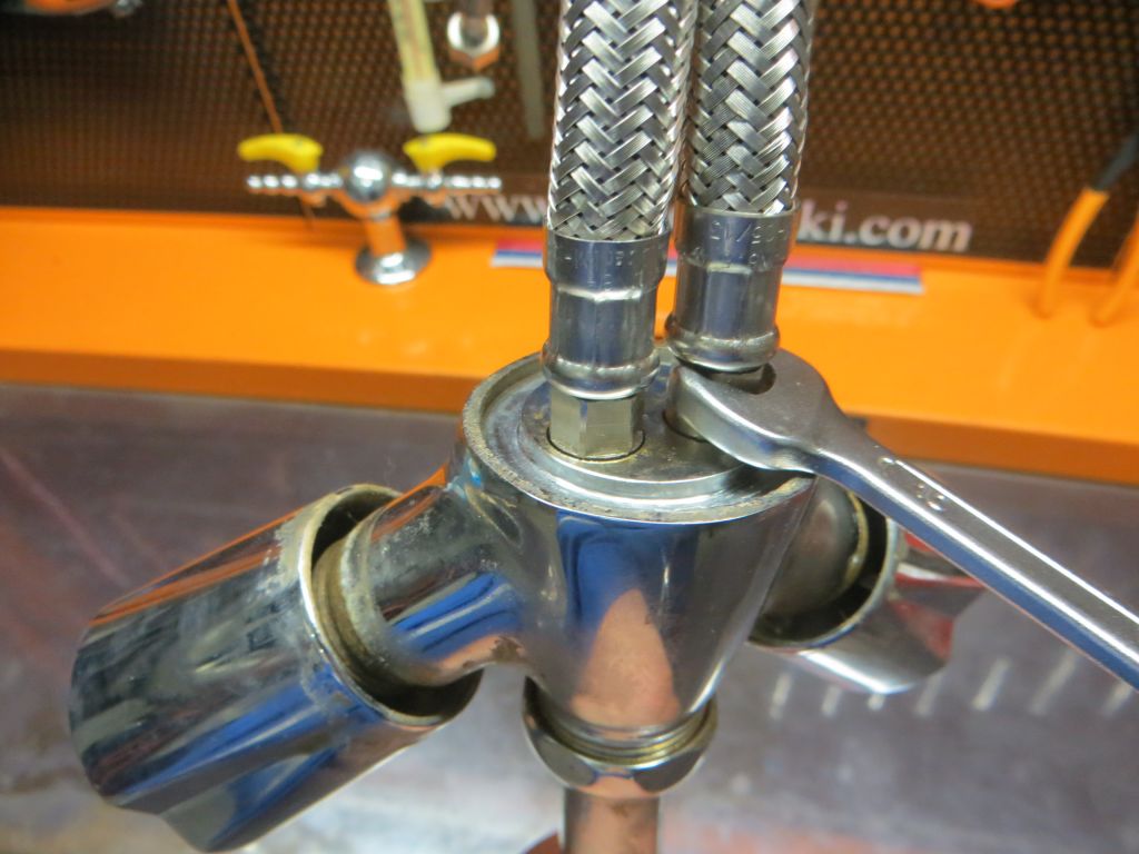 - Затем осматриваем места фиксации гибкой проводки к водопроводу, если ранее, перед заменой смесителя вы проверяли шланги, то можно приступать к их отсоединению. Это проще всего делать с помощью специального сантехнического ключа, но вполне подойдет и рожковый необходимого размера.