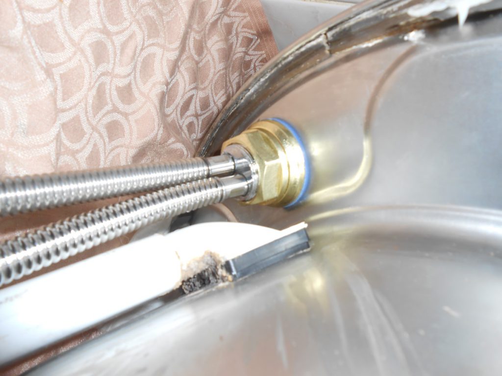 - Вставьте корпус смесителя в отверстие в раковине или мойке. Если его нет, то его можно сделать, только кромки тщательно обработать напильником.