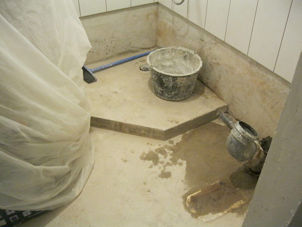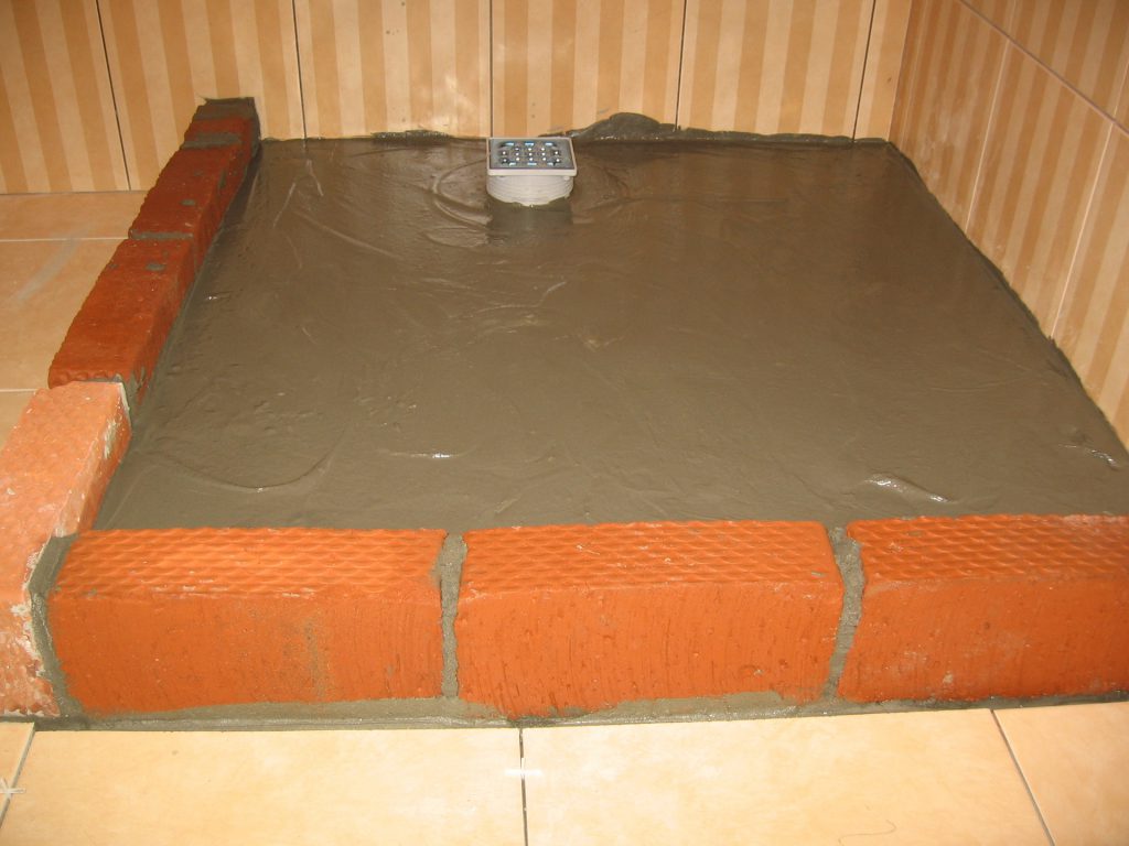 - Заливка места монтажа цементом. Зазор между цементной поверхностью и основанием изделия должен соответствовать толщине слоя плиточного клея и напольной плитки.